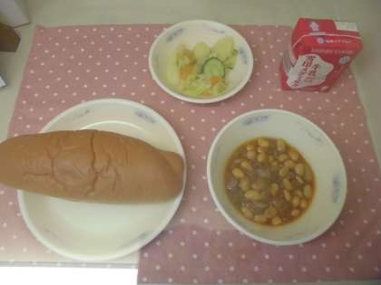 9月12日(火)の献立は,黒糖コッペパン,牛乳,チリコンカーン,野菜のソテーでした。