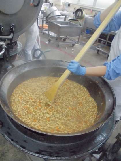 大豆は,給食室で朝一番にふっくらとするまで茹でます。大豆のゆで汁も使い,1時間以上煮込んで煮汁がとろっとしたら完成です。調理員さんが,火加減を調整しながらおいしく仕上げてくださいました。