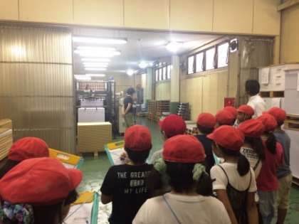 大きな印刷機で,どんどんと紙に日付が印刷されていく様子を見たり,裁断機で紙を切ったりしていくところを見せてもらいました。