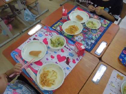 給食室の見本を見るなり,「スパゲティだー!」と大喜び。教室では,おかわりに行列ができていて,うれしそうに食べていました。