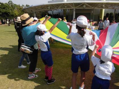 「はしれちょうとっきゅう」の親子競技では,お父さん,お母さんと協力し,リレーをしました。最後まで電車をつなぐことができました。