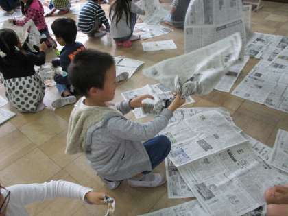 新聞紙を丸めたり,ねじったり,つなげたりして,創造的に作っていました。