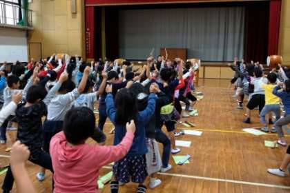太鼓のバチの持ち方を教えてもらった後,たたくリズムを教えてもらいました。