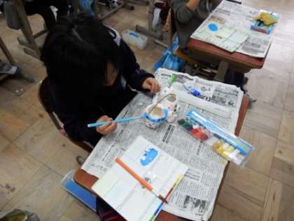 先週,自由参観で作った小もの入れに色を塗りだしました。