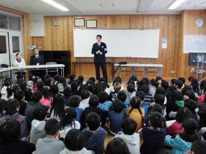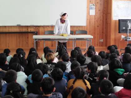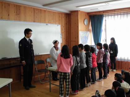 つくっていただいている間に女性会の方から小豆粥について,また向日町警察の方から安全についてお話していただきました。きちんとお礼の気持ちを伝えていた子ども達。これからいよいよ小豆粥をいただきます。