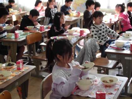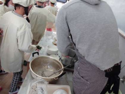 「いただきます!」できたてのあったかい小豆粥を嬉しそうに食べていた子ども達。おかわりに行列ができていました。心もほかほかになった小豆粥でした。