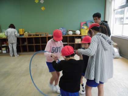 3月8日(木)の2校時に,大空3の教室で体育をしました。この日は,みんなで手をつないで輪になり,フラフープを一人ひとりくぐって回していくという活動をしました。