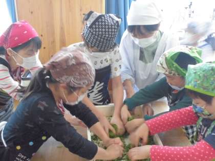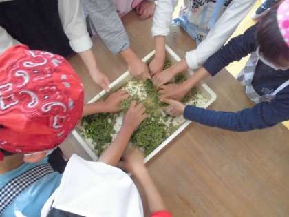 9日(水)に図工室で「久我菜漬け」体験を行いました。6年生と2年生が地域の方と一緒に,菜の花に塩とぬかを手で揉みこむ作業を行いました。完成した久我菜漬けは,刻んでチャーハンに混ぜると美味しいそうです。子どもたちは作った久我菜漬けの完成を楽しみにしていました。