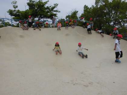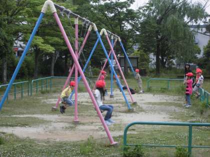 向かった先は,いろいろな遊具です。学校には無いブランコに・・神川学区には無いような巨大すべり台・・体育科の学習でおなじみの鉄棒・・。