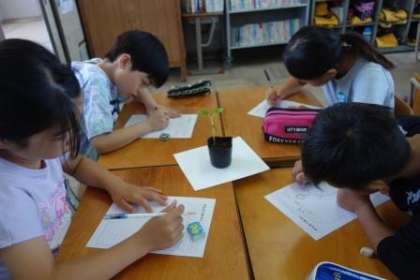 ツルレイシが発芽したので、観察をしました。「子葉がある」、「白菜みたいに丸まっているよ」、「くきがななめになってる!」などたくさん発見がありました。