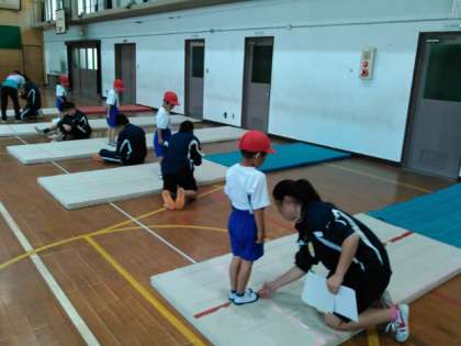 今日は低学年の体力テストの日。1年生は「立ち幅跳び」にトライしました。