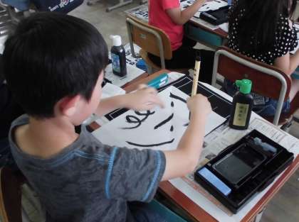 今日は書写の学習で,初めて習字をしました。用具の置き場所,筆の持ち方を確認した後に,直線や曲線を書く練習をしました。筆をまっすぐにして書くことに慣れない様子でしたが,みんな熱心に取り組んでいました。