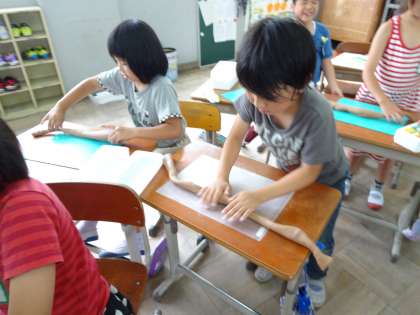 図画工作科で「切って かきだして くっつけて」の学習をしました。今日は久しぶりに粘土を使うので,カチカチに固まった粘土をほぐしました。