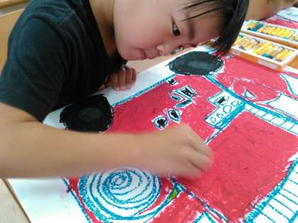 今日の図画工作科の時間に1年生は,以前写生をした消防車の絵を完成させました。