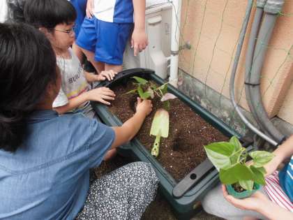 今日は,京エコロジーセンターの担当の方や洛いもの先生,そして地域の方々をゲストティーチャーにお招きして,植え方や育て方を丁寧に教えていただきました。