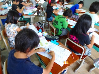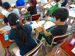 算数の「円と球」の学習で,円には直径や半径があることを知ったり,コンパスを使ってきれいに円を描く練習をしたりしています。初めてコンパスで円を描いたときには,鉛筆の線がずれてしまう子が多くいましたが,繰り返し練習することで,上手に描けるようになってきました。コンパスで色々な模様を描くなど,楽しみながら熱心に取り組んでいます。