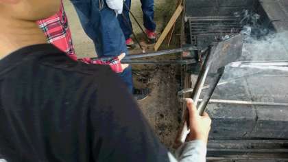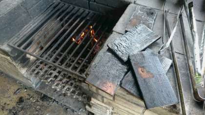 焼き杉板とは,豚汁を作ったかまどの火で表面が黒くなるまで炙った杉の板のことです。このあと板を磨いていくと綺麗な光沢がでてきます。