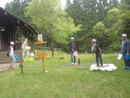 フライングディスクゴルフはゴール目指してフリスビーを投げ、何回で入ったかを競うゲームです。どうすればよく飛ぶか試行錯誤しながら楽しそうに活動していました。