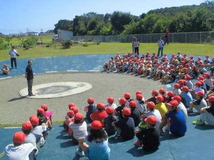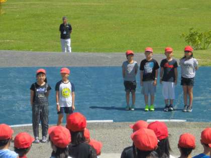 青空のもと、校旗が掲揚されるのを見ながら校歌を大きな声で歌いました。