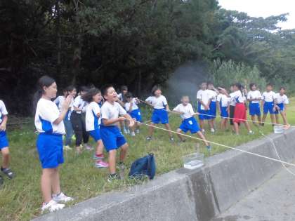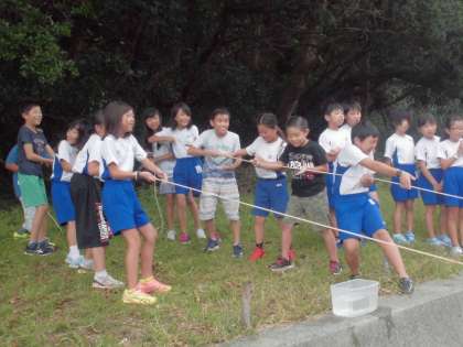 みんなの願いがかなうように、力を込めて声を合わせて気合を入れてロープを引きます。そのかいあってか、イシダイ、フグ、カワハギ、カサゴなどの魚やいろいろなカニ、ヤドカリなど結構いろいろな生き物がとれました。
