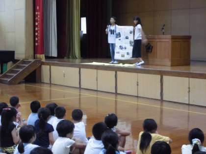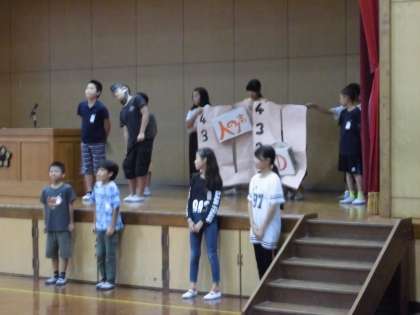 まず初めに,委員会からの発表がありました。栽培委員会からは緑のカーテンの紹介が,飼育委員会からは飼っている動物のクイズが,放送委員会からは放送の仕方の紹介が,運動委員会からはドッジボール大会の表彰が行われました。また,児童会本部からは校舎内や運動場で安全に過ごすための呼び掛けと,先日行われた京(みやこ)キッズ会議で話し合ったことの発表がありました。