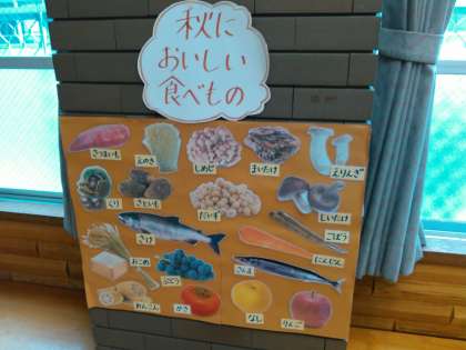 「サンマ!」「近所の田んぼのお米!」「サツマイモ!」などなど食べ物シリーズもあれば,「赤とんぼ!(今の時期に観られる赤とんぼは,アキアカネ)」「スズムシ!」「コオロギもそうだね。」といった生き物シリーズなどたくさんの発表の声が出てきました。
