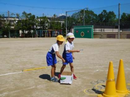 輪投げを投げる練習をしたり,