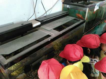 「あ,飼育小屋にウサギがいるよ!」「シロとココアっていう名前だって〜。」「ウズラってハリネズミみたいに丸いね。」「この魚ってなんやろう・・?(ギンブナとホンモロコだね)」「うちの金魚よりおっきいわ!」など発見したことを口々に伝え合っていました。