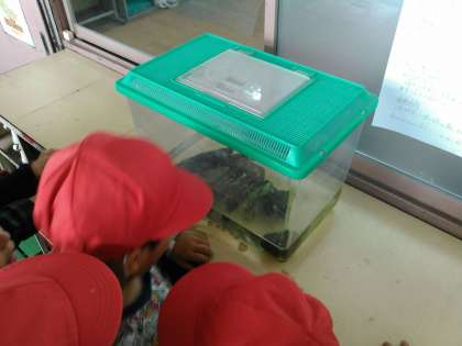また,1年生の教室で暮らしているニホンスッポンとアカハライモリも観に行きました。