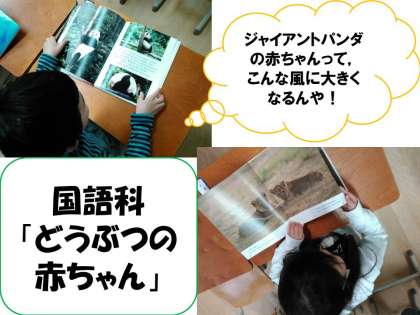 「へぇ,イルカの赤ちゃんって生まれてすぐに泳げるんや!」「キリンの赤ちゃんとシマウマの赤ちゃんって,大きくなる様子が似ているね。」「ゴリラの赤ちゃんは・・なんか違う!?」といったつぶやきが1年生から聞こえてきます。