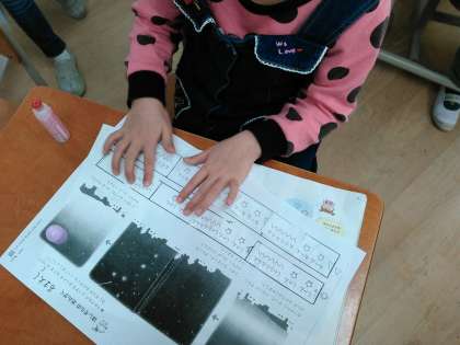 ワークシートに取り組む1年生からは「夕方は星が少ないから,すずの音が良いかな。」「夜は星がいーっぱいあるから,たくさんの音を入れてみよっと。」といった声が聞こえてきました。