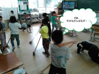 今では,きちんと1年生だけで友だちと協力しながら清掃活動に取り組む姿が見られています。しかも「あと5分で終わるし,急ご!」「上雑巾さん,ゴミ捨てお願いしまーす。」といった声かけまで聞こえてきます。