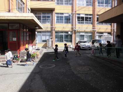 ランチルームからスタートして,体育館,職員室,図書室,運動場,そして給食室を探検して教室に戻りました。「ここでご飯を食べるよ。」「ここは先生がいるよ。」「絵本がたくさんある。」とそれぞれの部屋の説明をしてくれました。中間休みは,体育館で遊びました。