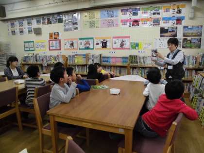 今年度,初めて第2図書室に行きました。いつも行く第1図書室には読み物の本がたくさんありますが,第2図書室には図鑑や科学読み物などがたくさん並んでいます。どんな本があるのか図書支援員さんに紹介をしてもらいました。子どもたちが大好きな乗り物や生き物,食べ物などがあり,みんな真剣に本を選んで読んでいました。
