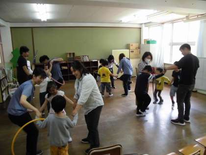 学校の先生たちと交流しました。初めに自己紹介をして,その後,グループに分かれてフラフープおくりをしました。手をつないでフラフープをくぐって隣の人に送ります。先生たちと一緒にできてとても楽しそうでした。最後は,握手をして終わりました。明日はまた違う先生たちが来てくれます。たくさんの先生と仲良くなりたいです。