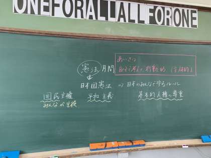 校長先生から憲法の意義や意味についてお話がありました。お話を受けて,学級に戻ってから,憲法について改めて考え話し合いました。