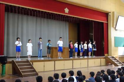 月曜日の児童朝会では,前期の各委員会委員長が自己紹介をしました。一人一人が,どんな委員会活動を行っていきたいか,抱負を語りました。