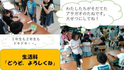 「2年〜組の・・です。よろしくね。」「一緒に学校探検,回ろうね。」