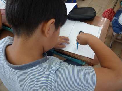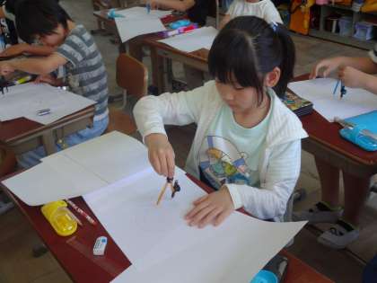 算数科で「円と球」の学習をしています。今日はコンパスを使って円を描く練習をしました。「ずれちゃう。難しいな。」と言っていた子も,練習をするうちに「やったー!きれいな円が描けた!」と,どんどん上手に円を描くことができるようになっていました。