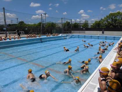 1年生で学習したプールのルールを確認した後は,プールの中を歩き回ったり,犬になって歩いたりと色々な形で学習を楽しみました。