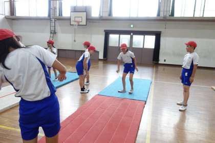 体育では,マット運動をしています。どうしたらできるようになるか,美しくできるようになるかを考えたり,お互いにアドバイスをし合って活動しています。回数を重ねるごとに,できる技が増えたり,きれいにできるようになったりしてきました。