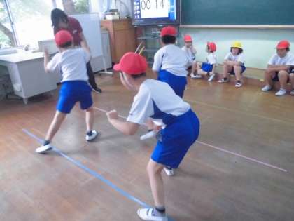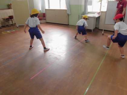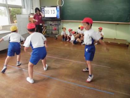 体力テストの一つ,反復横跳びに挑戦しました。3本のラインを順番にまたいで回数を数えます。ピョンピョン,ピョンピョン,20秒間みんな頑張って跳んでいました。