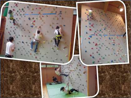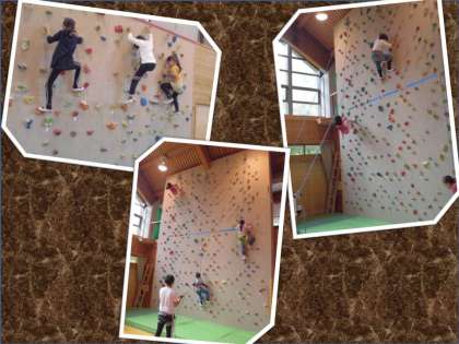 お昼からの活動は,2クラスずつに分かれて,「ボルダリング・クライミング」とアスレチック「冒険の森」に挑戦しました。