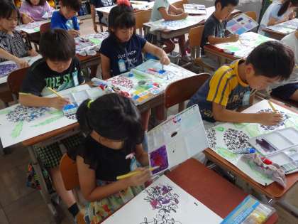 図画工作科の学習で「アジサイ花」をかいています。割りばしペンを使い,墨汁で一枚一枚の花びらを描き,絵の具で丁寧に色を塗りました。どの子も集中して,ステキな作品に仕上げることができました。