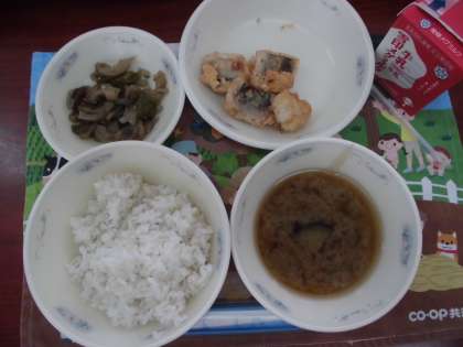7月4日(木)の献立は,麦ごはん,牛乳,はものこはくあげ,伏見とうがらしのおかか煮,なすのみそ汁でした。