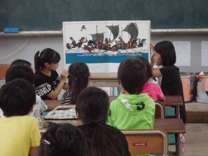 大型絵本が登場し,「あ,その本読んだことあるよ!」「えー,あの絵本ってそんなに大きいのがあったん!?」と興奮気に言っていた2年生。ですが,お話が始まると一気にお話の世界に引き込まれていました。