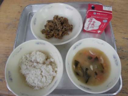 7月11日(木)の献立は,麦ごはん,牛乳,さばめし(具),トマトだご汁でした。