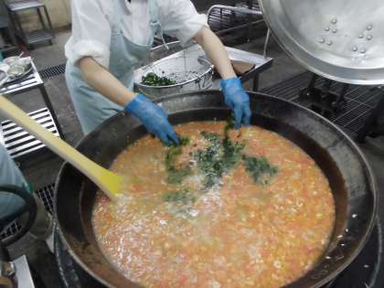 トマトだご汁は,トマトを練りこんだだんごが入った汁物のことです。だんごの生地は給食室で手作りしています!スプーンで一口サイズにすくってだし汁に落としていきました。