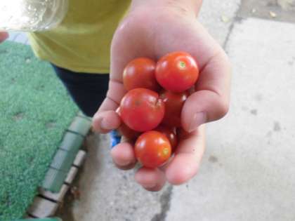 「今日は7個も取れたよ!」「トマトの背がむっちゃ伸びてきたよ!」「この前は,サラダに入れてもらったよ。」と言って,みんなとても嬉しそうです。