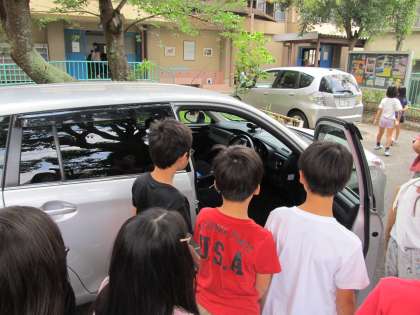 また,最後には車いすの方用に改造したと話しておられた車の運転席も覗かせていただくことができ,子どもたちも興味津々でした。